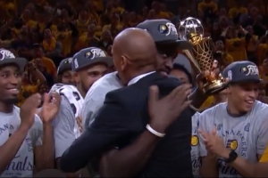 赛后,步行者名宿雷吉-米勒为西卡颁发东决MVP拉里-伯德杯。
