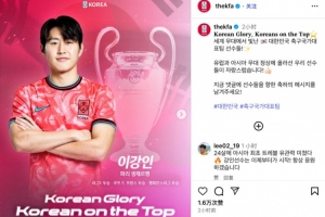 韩国足协今日在官方ins上晒出主题为“韩国荣耀”的李刚仁夺冠海报,并配文写道:“在世界舞台闪耀的韩国国脚!为他们感到骄傲和自豪,他帮助球队登上欧洲之巅!”