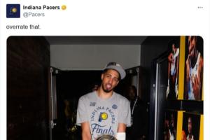 赛后,步行者官推晒出哈利伯顿手捧东决冠军奖杯的照片,并反讽那些选哈利伯顿是“最被高估的球员”的人:“来高估一下这个啊!”