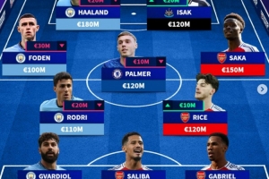 中场:福登(曼城,1亿欧)、罗德里(曼城,1.1亿欧)、帕尔默(切尔西,1.2亿欧)、赖斯(阿森纳,1.2亿欧)、萨卡(阿森纳,1.5亿欧)