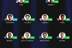 中场:拉菲尼亚(巴萨)、维蒂尼亚(巴黎)、基米希(拜仁)、亚马尔(巴萨)