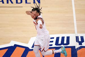 季后赛,布伦森出战18场,场均37.7分钟贡献29.4分3.4篮板7助攻,三项命中率分别为46.1%、35.8%、85.1%。