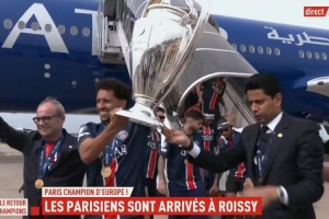 《队报》晒出视频,巴黎将士、主席纳赛尔和顾问坎波斯等人回到巴黎,队长马尔基尼奥斯和主席纳赛尔捧着大耳朵杯下飞机,马尔基尼奥斯随后还在镜头前再次高举奖杯。