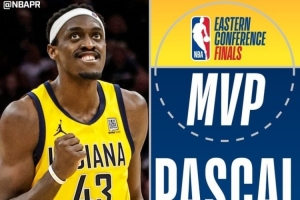 体育资讯6月2日讯 东部决赛步行者4-2淘汰尼克斯。西亚卡姆(喀麦隆)当选东决MVP。