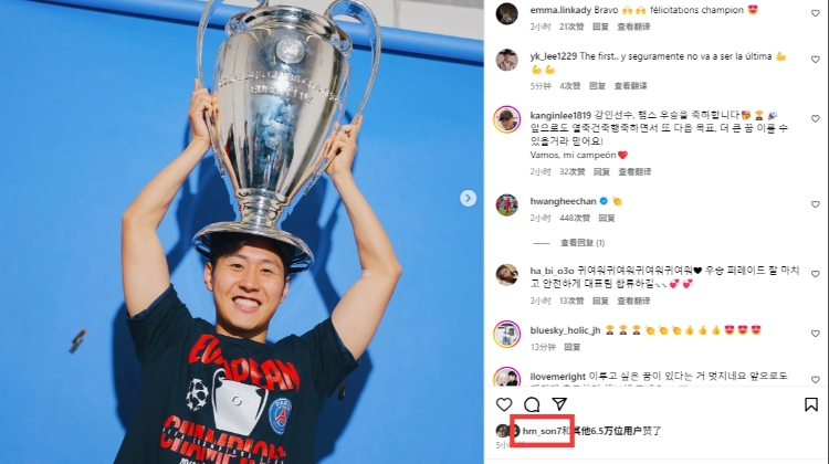 本赛季,热刺夺得欧联冠军,此前孙兴慜晒照庆祝时李刚仁也点了赞。
