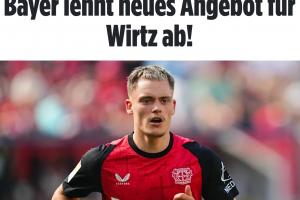 体育资讯06月02日讯 德媒《图片报》确认,勒沃库森拒绝了利物浦对维尔茨的第二份报价,总价1.3亿欧元!
