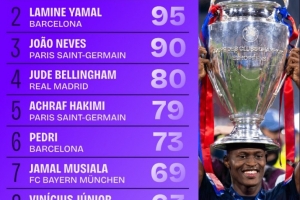 体育资讯6月2日讯 2024-25赛季的欧冠已经落下帷幕,巴黎圣日耳曼以5-0的比分大胜国米夺冠。Squawka统计出了欧冠多项数据排名情况,努诺-门德斯以98次位居地面对抗榜榜首。