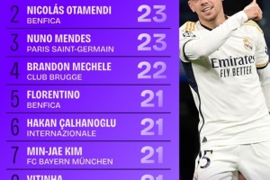 体育资讯6月2日讯 2024-25赛季的欧冠已经落下帷幕,巴黎圣日耳曼以5-0的比分大胜国米夺冠。Squawka统计出了欧冠多项数据排名情况,巴尔韦德以27次位居拦截榜榜首。