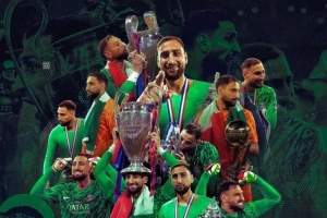 巴黎本赛季获得法甲冠军、法国杯冠军和欧冠冠军,达成三冠王壮举,多纳鲁马社媒晒出三冠王个人海报,配文:“历史🏆🏆🏆”