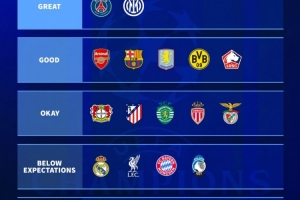 体育资讯6月3日讯 德国转会市场评估了各队本赛季欧冠的表现,并列出级别,巴黎、国米表现杰出,阿森纳、巴萨、维拉、多特、里尔优秀。
