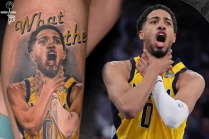 体育资讯6月3日讯 据研究NBA纹身自媒体inkednba报道,一位步行者球迷在小腿上纹了哈利伯顿扼喉庆祝动作的纹身。