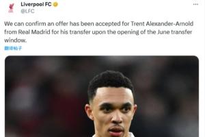 利物浦官宣阿诺德离队:我们可以确认,俱乐部接受了皇马针对阿诺德的报价,他将在6月转会窗开启时离队