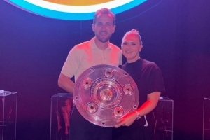 凯蒂社媒晒出手捧德甲冠军奖盘与凯恩的合照,配文:“德甲冠军。”