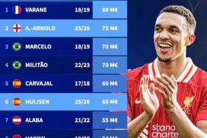 体育资讯6月4日讯 德国转会市场网统计了皇马队史后卫身价榜单,今夏新援阿诺德德转身价7500万欧元第二,怀森6000万欧元第六。