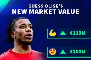 23岁的奥利塞目前的身价为8000万欧,他在去年夏天以5300万欧加盟拜仁,本赛季为拜仁各项赛事出场50次,贡献17球18助攻。