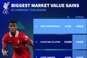 体育资讯6月4日讯 德转列利物浦球员本赛季身价涨跌榜,赫拉芬贝赫本赛季身价+4000万欧队内上涨最多,努涅斯本赛季身价-2500万欧下跌最多。