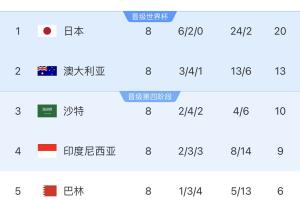 国足净胜巴林5个,印尼净负日本2球,国足、印尼净胜球均为-8;