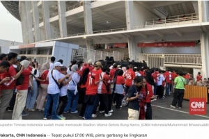 从中午开始就已有球迷在体育场外排起了长龙,目前他们正有序进场,尽管一些人显得有些焦急。不到5分钟的时候,体育场里就成为了红色的海洋,大多数球迷都身穿着代表印尼的红色球衣,尽管也有部分球迷穿着的是其他颜色。