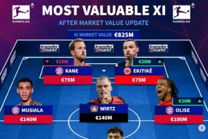体育资讯6月5日讯 德转更新德甲球员身价,列出德甲身价最贵阵容,凯恩、埃基蒂克搭档锋线,穆西亚拉、维尔茨在列。