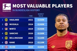 体育资讯6月6日讯 德国转会市场列出了德甲球员历史最高身价榜,哈兰德1.5亿欧居首,穆西亚拉、维尔茨1.4亿欧,奥利塞1亿欧。