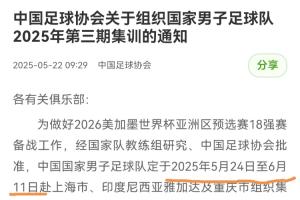 国足6月5日对阵印尼,而集训从5月24日就已开始