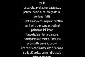 “而事实是,这四年国际米兰斩获六座奖杯。我生为拉齐奥球迷,初恋永难忘,却我学会了热爱国际米兰。但最爱的永远是我父亲,这段深情终以最美方式落幕,争吵后的拥抱,为成长而别离,为足球而活与热爱足球,终究是两回事。”