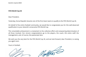 此前他再次通过国际足联的官方信函表达了祝贺,他在贺信中表示:“这一杰出成就是所有相关人员共同努力和坚强意志的体现。我谨向韩国队的球员、包括主教练在内的教练组、支持团队以及所有热情的韩国球迷致以最诚挚的祝贺。”