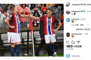 厄德高在社交媒体上晒出与哈兰德扶角旗杆叉腰的合照,庆祝球队取胜,哈兰德留言附上戴墨镜的笑脸表情。