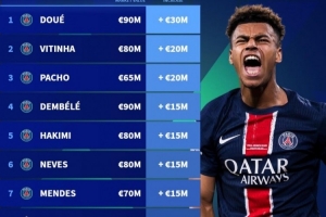 1、杜埃(巴黎圣日耳曼),现身价9000万(+3000万)