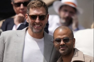 镜头捕捉到,NBA独行侠名宿诺维茨基和马刺名宿托尼-帕克一同来到现场观战,两人并肩合影。