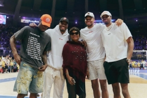 体育资讯6月9日讯 今日,雄鹿球星字母哥携哥哥萨纳西斯(左二)、弟弟科斯塔斯(右一)、亚历克斯(左一)还有母亲前往巴西,观看了2025世界女排联赛分站赛第一周巴西女排vs意大利女排的比赛,赛后还与女排队员亲切合影。