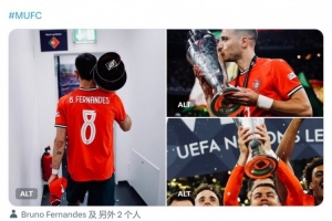 曼联官方社媒晒出队内葡萄牙国脚B费、达洛特与奖杯的合照,以及C罗举杯的照片,配文:“祝贺B费和达洛特,我们的欧国联冠军!”