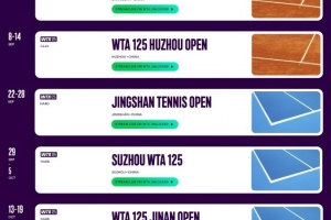 体育资讯6月9日讯 WTA官方消息,中国新增五站WTA125级别赛事,举办地分别是长沙、湖州、京山、苏州和济南。