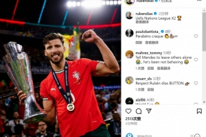 鲁本-迪亚斯此役为葡萄牙踢满120分钟,赛后他在社交媒体上晒出手拿奖杯的照片,配文:“欧国联冠军X2🏆”