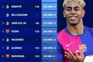 体育资讯06月09日讯 德转更新西甲联赛身价,亚马尔2亿欧元成为世界第一,姆巴佩上涨1000万升至1.8亿欧元,维尼修斯下降3000万降至1.7亿欧元。