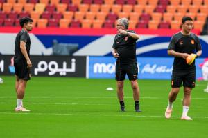 国足众将的神情都比较放松,主帅伊万科维奇则和郑智等教练组成员一起商讨战术。