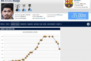 最新的身价页面显示,现年26岁的阿劳霍目前身价降至3500万欧,回到2021年的水平。