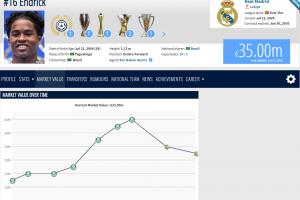 恩德里克加盟皇马以后,身价连续两次遭遇下调。回看去年同期,恩德里克彼时6000万欧的身价是他生涯迄今为止的巅峰。