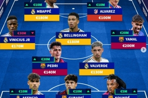 前锋:姆巴佩(皇马,1.8亿欧)、阿尔瓦雷斯(马竞,1亿欧)