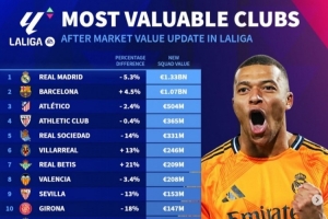 1、皇马:13.3亿欧(-5.3%)