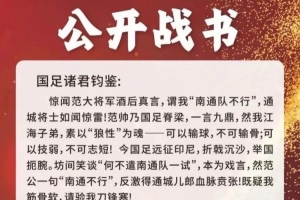 7日,网上出现了一篇名为《南通草根足球队致中国国家男子足球队公开战书》的文章,文章称:“惊闻范大将军酒后真言,谓我‘南通队不行’,通城将士如闻惊雷!”随后文章以“南通草根足球队”的名义向国足下战帖,要求约定时间地点、规则尺度等。文章表示,若南通队败,全队登报敬告天下:“范帅慧眼,吾辈确逊国足!”若国足负,只求诸君一句:“南通,可战!”