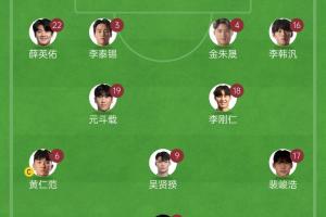 韩国替补:1-金东宪、21-赵贤祐、5-朴镇燮、20-权敬原、2-赵贤泽、8-朴乘煜、14-崔浚、13-金植圭、10-李在城、15-杨贤俊、7-孙兴慜、11-黄喜灿