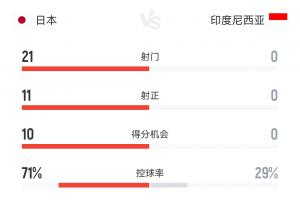 体育资讯06月10日讯 18强赛第10轮,日本主场6-0横扫印尼,全场数据日本狂射21脚11次射正,印尼0射门!