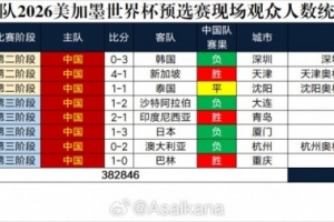 中国队本届世界杯预选赛在国内8个城市进行了8个主场比赛,主场总观众人数为382846人,场均47856人,其中杭州奥体中心和澳大利亚的比赛观众人数70588人,为最高数字。主客场全部16场比赛总观众人数712145人,场均44509人。