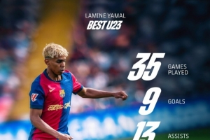巴萨社媒晒出亚马尔本赛季西甲个人数据海报,并配文:当下与未来的璀璨巨星💎