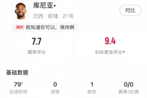 体育资讯6月11日讯 世预赛南美区第16轮,巴西1-0巴拉圭,库尼亚首发出战,球员本场数据如下:
