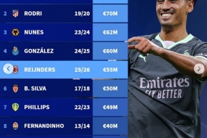 体育资讯6月11日讯 曼城官方宣布签下赖因德斯,德转也盘点了曼城队史引进中场球员花费榜,其中赖因德斯5500万欧(固定转会费)排名第5,以下为具体情况: