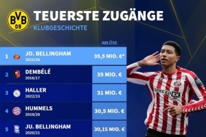 体育资讯6月11日讯 德国转会市场统计了多特队史引进球员的转会费,并列出榜单,乔布-贝林厄姆3550万欧居首,登贝莱、阿莱前三。