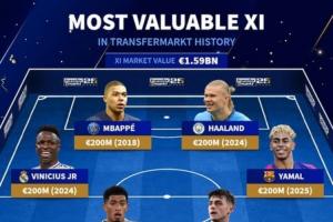 体育资讯06月11日讯 德转在25周年之际列出网站历史身价最贵阵容,哈兰德、姆巴佩、亚马尔、维尼修斯以2亿欧领衔。