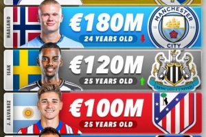 体育资讯6月13日讯 2024-25赛季结束,Score 90更新了前锋的身价排行,皇马攻击手姆巴佩以及曼城的哈兰德都是1.8亿欧元。